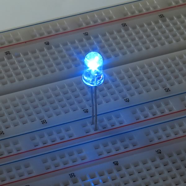 Blinding blue clear lens 5mm LED lights up when 3.2VDC @ 30mA is applied. Rated 100mW, this powerful LED is really bright. Sold in a package of 10.