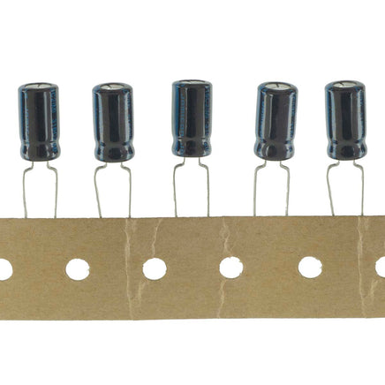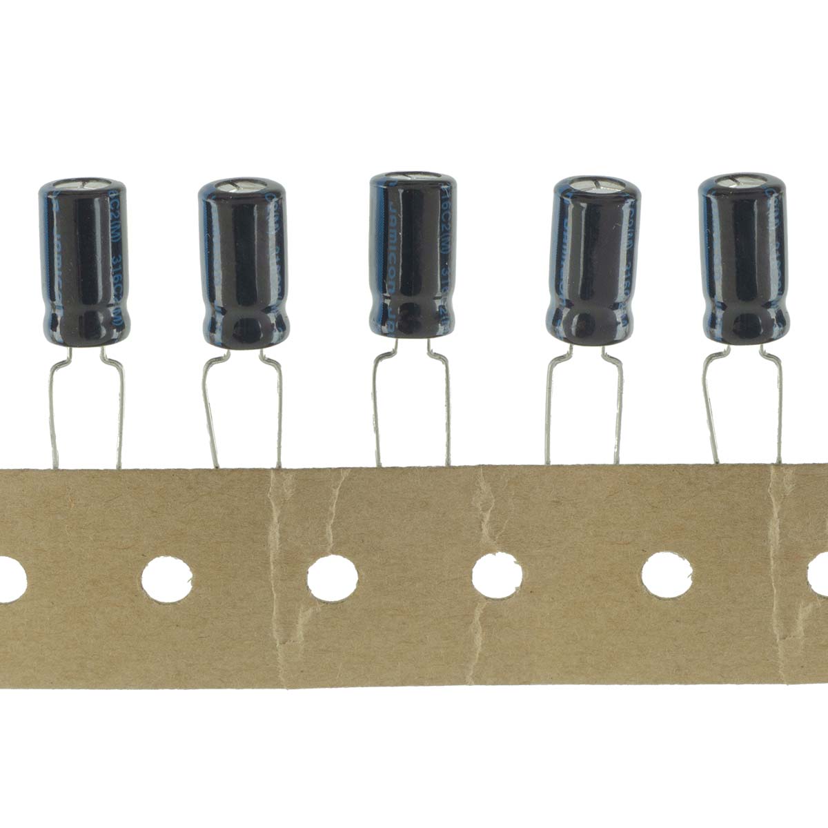 Super compact Jamicon 470uF 6.3V 105ºC radial capacitor is only 0.25" dia. x 0.47" tall. Sold in a package of 10 on tape and reel.