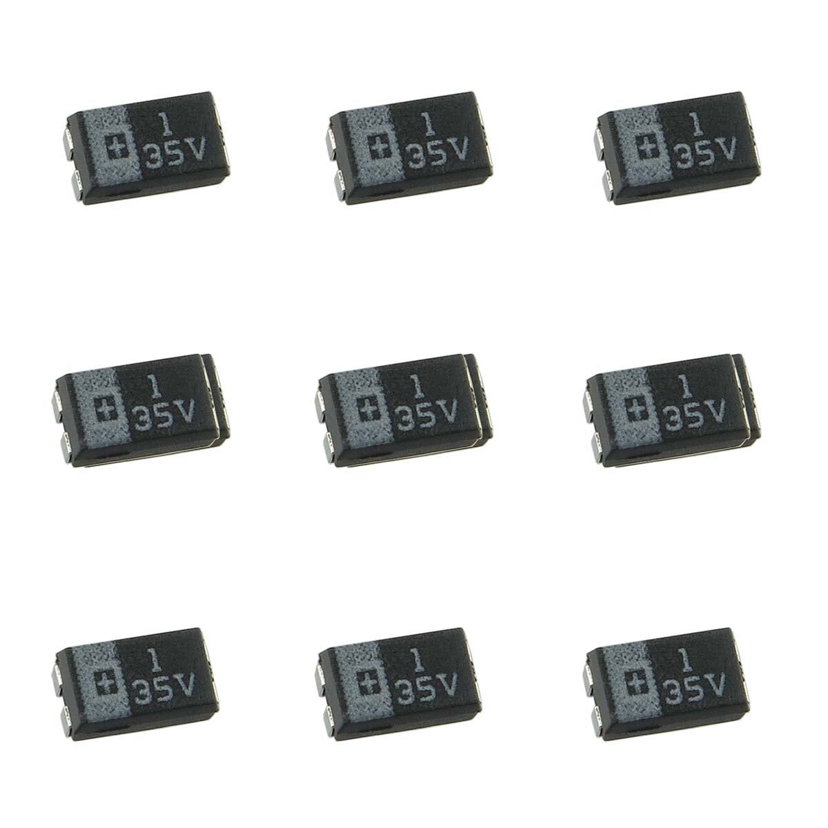 Small 1UF 35VDC SMD tantalum capacitor is only 4.7mm long x 2.6mm wide x 1.95 tall. Sold on tape and reel of a package of 10.