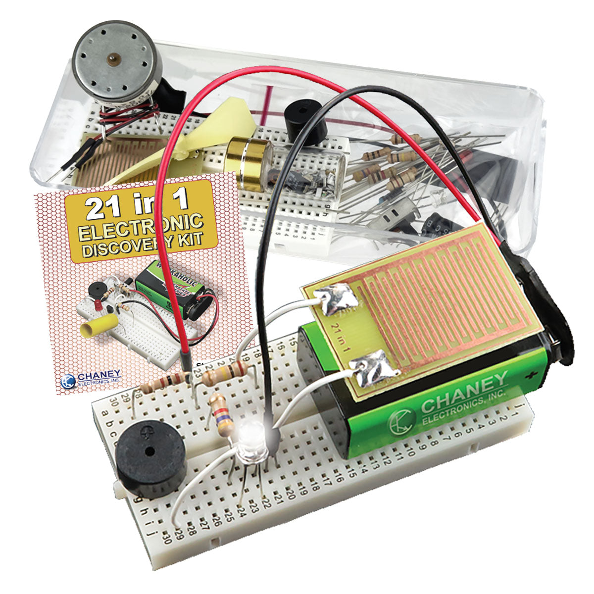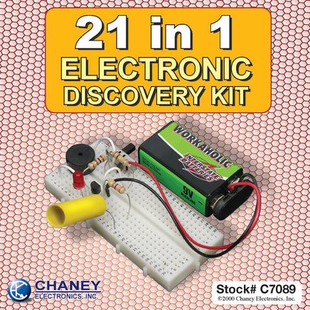 21 in 1 Electronic Discover KitThis is the perfect lab for anyone interested in discovering basic electronic components and electronic circuitry. This kit consists of a re-usable no solder breadboard and various electronic components including a buzzer, motor, capacitor, CDS cell, resistors and LEDs. Not only do you discover circuits that use these components, you'll also make many fun functional projects. This kit does not require any soldering and is self contained in a reclosable 5.75" x 2.5" x 2" plastic storage box with small booklet.
