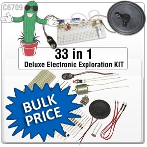 Product Priced For Orders of 6 or More Lower your classrooms carbon footprint and save with our bulk package pricing. Bulk orders of 6 or more are grouped in a space saving package for easier teacher distribution. (Note: Bulk orders will not be shipped in their own separate boxes.) Orders under 6 are individually priced and boxed. Click Here for Individual Boxed Kit PricingThis exciting breadboard kit requires no soldering or previous electronic experience. The kit enables any student to build 33 different electronic experiments and activities. The kit is meant to be used over and over again to save money. Not only is this kit complete with everything the student needs, but also the instruction booklet is designed so that the teacher does not need to be involved (unless he or she desires to be). The student builds and studies the first 11 instructional circuits which include theory and data facts along with a simple pencil activity quiz. The remaining 22 experiments for the student are fun to build electronic circuits that have a parts list, schematic and parts placement drawing.These give the student an ample introduction to electronic components and circuitry. Breadboard type kits have been around for years, however, ours is the first to incorporate an introduction to Ohm's law, electromagnet circuitry, motor circuitry, transistor circuitry, IC circuitry and 7 segment display circuitry all in one kit. There is now no need to have several different breadboard kits to learn basic electronic concepts. One kit covers almost all aspects of basic electronic concepts and components. Not only does our 33 in 1 Deluxe Electronic Exploration Kit introduce various electronic educational concepts but it is also a fun and interesting motivational activity for your student. Complete with all electronic parts, breadboard and instruction booklet. Requires one 9V battery (not included). If the student has already built the 33 in 1 Deluxe Electronic Exploration Kit, you may wish to purchase our 35 in 1 Deluxe Digital Lab Exploration Kit so that the student can gain digital electronics fundamentals.Construction Activity 33 - Adjustable Blinking Light and Sound