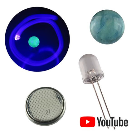 Radioactive (can be detected by a Geiger Counter with SBM-20 tube) Vaseline glass marble is a light grey/green with swirls visible. As soon as you light it up with the included battery/UV LED it glows a bright yellow green. Marble is about 0.6" (15mm) in diameter. Set included radioactive marble, UV LED and CR2032. Just slide LED onto battery (long leads goes to (+) and short to (-), the LED will glow a purple (UV) color.