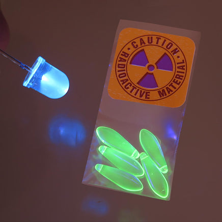 Radioactive 5 x 16mm uranium glass dagger beads made in the Czech Republic in a sealed package of 5 are slightly radioactive and can be detected by our G21276, CJ304, or C8092 Geiger counters. In addition to the beads, you will receive a giant 10mm UV LED and a coin battery. Place the leads across the coin battery (longer lead +) and the beads will glow brilliant green under the ultraviolet light!