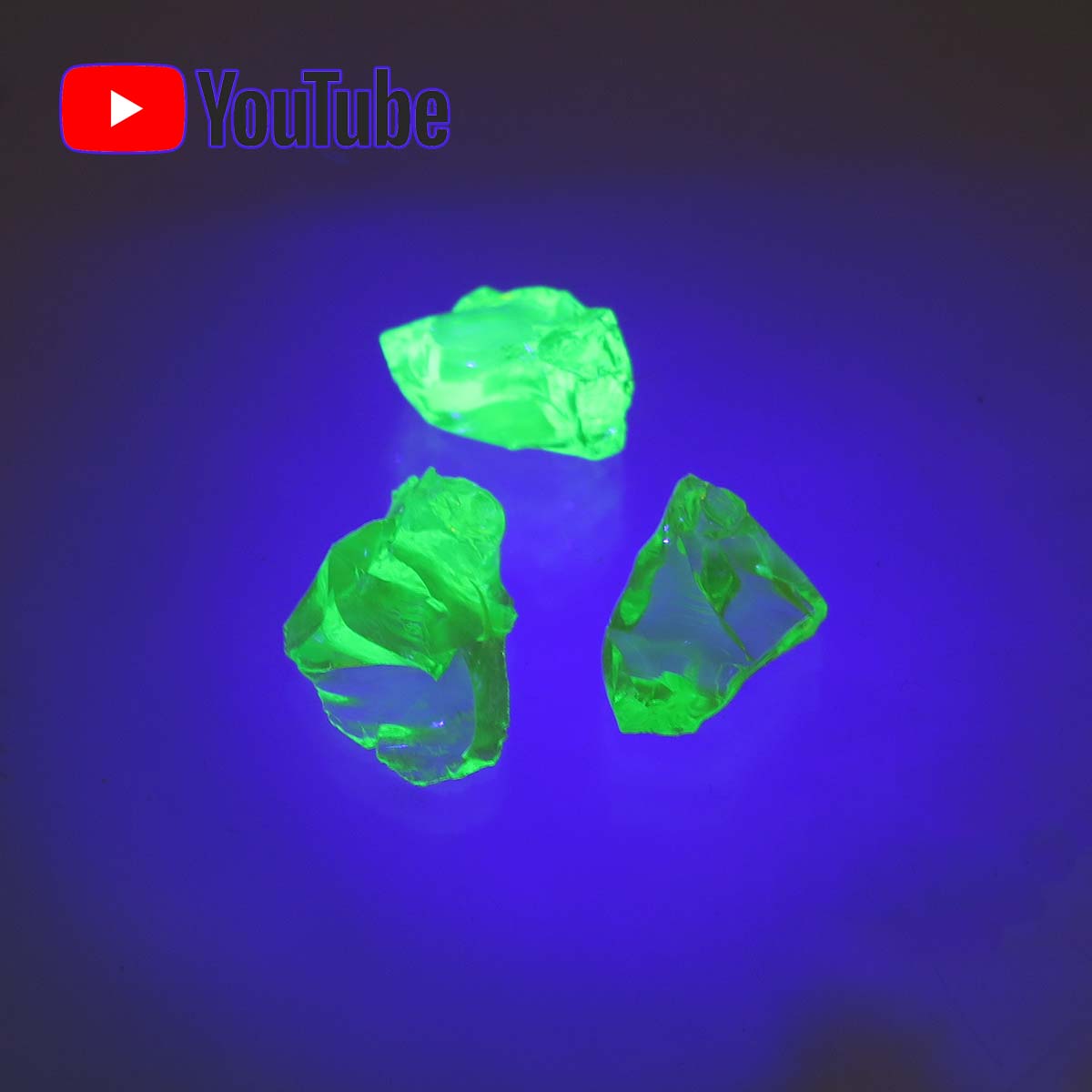 This is similar to our G26598 Glass Cullet Assortment but these are smaller size cullets. Each Vaseline cullets in this assortment contain Uranium Oxide Diuranate. This causes each piece to be fluorescent and slightly radioactive. Each rock (cullet) you receive will glow a brilliant see thru green under UV light from UV LEDs or UV flashlights. Each of these rocks emit enough radiation to be detected by any of our sensitive Geiger Counters. Every assortment will be unique and very from the picture shown. Please be careful when handling these as they have sharp points and edges. Sold in an assortment of 3.