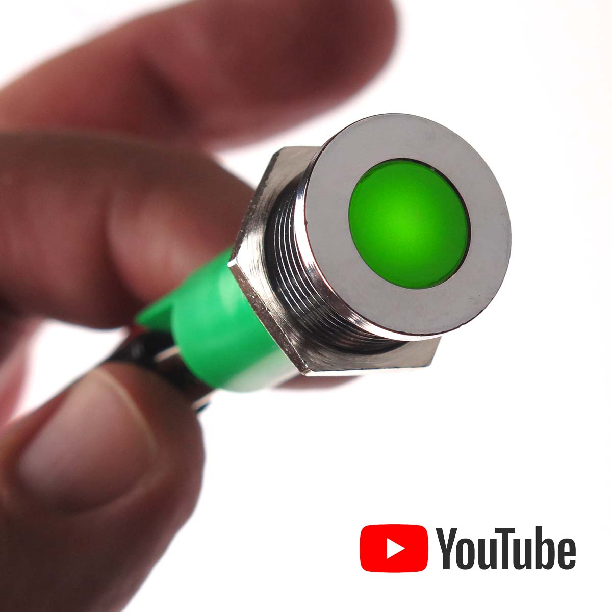 Green LED panel mount indicator operates on 24VAC or DC. Very stylish indicator features a chrome metal ring surrounding a flush diffused green lens. Mounts in a 0.64" dia. hole in panel with included nut. Outer diameter 0.723" x length 1.8". Brand new! Retails for $18.00 each.