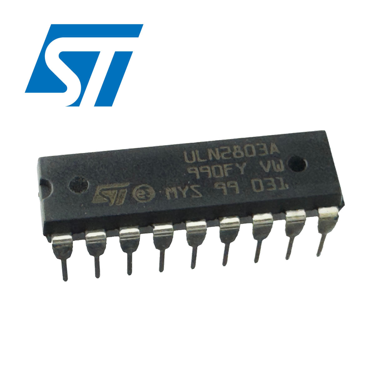 ST ULN2803A is an 18 pin thru-hole Dip IC containing 8 NPN Darlington transistors. Each transistor is rated 500mA continuous and 50V in off state.