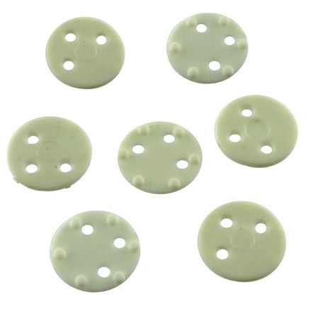 Insulated white plastic spacer for TO-5 metal case transistors has 3 pre-drilled holes and 6 tiny "bumps/legs" on one side. Sold in a package of 25.