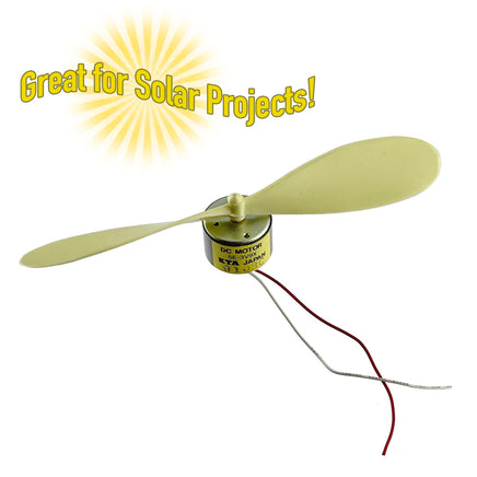 Super efficient small DC Motor with propeller type KTA 5E-3V9X operates down to 0.5VDC up to 5VDC. Size is 0.8" dia. x 0.6" long. Has 0.1" long x 1.2mm dia. Shaft with yellow propeller attached. Has color coded red and white flexible power leads. Great for powering from solar cells, coin batteries (CR2032) etc. Brand New!