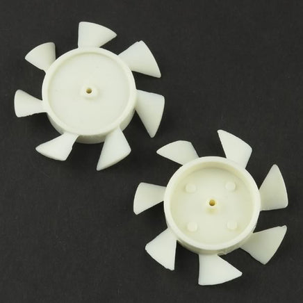 Small 2" diameter x 0.36" thick white plastic fan blade pushes onto any 2mm motor shaft. Efficient 7 blade design. Made from white plastic. Sold in a package of 5 fan blades.