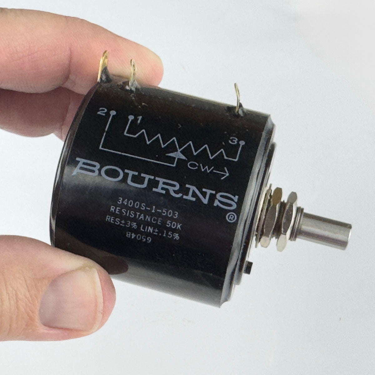 Bourns 34005-1-503 is 44mm (dia) × 44mm (L) 10 Turn precision Wirewound 50K Panel mount top. Linearity is 0.15%, resistance tolerance is 3%, and power rating is 5 Watt. New! Retails from $149 to $304.