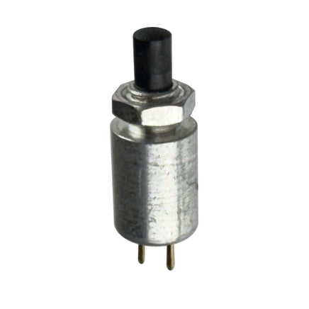 Subminiature high quality pushbutton switch mounts in a 3/16" dia. hole with supplied nut. Contacts are momentary action SPST normally open. Has tiny black pushbutton size about 0.25" dia. x 0.48" long (excluding terminals and black button). Brand New!