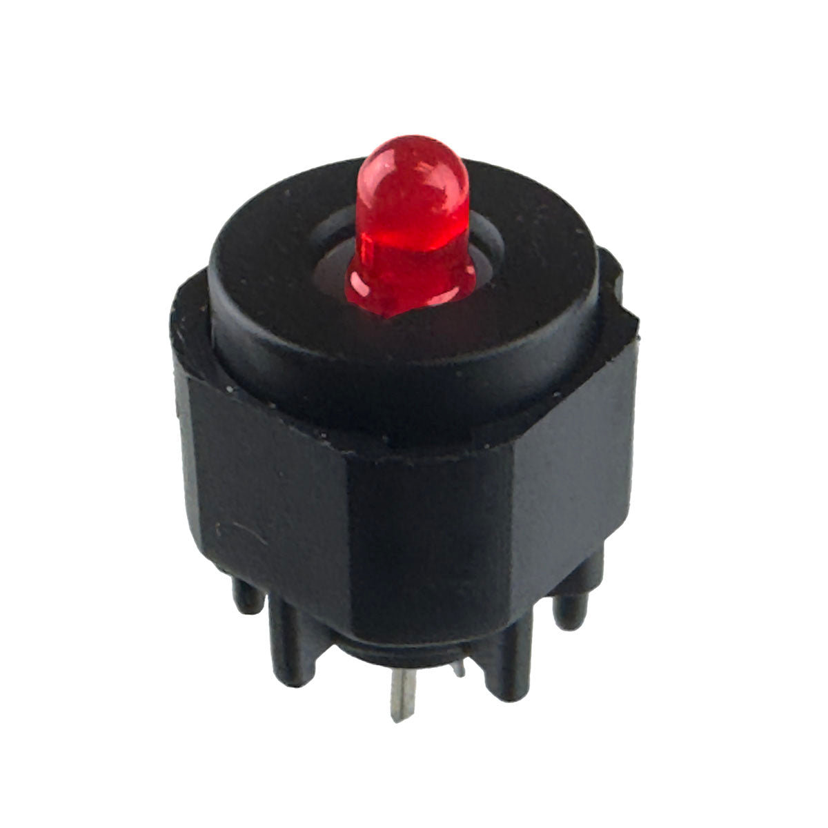 High performance lighted ITT Cannon PCB mount pushbutton switch features a bright red LED in center. When you press down on the outer ring, a SPST set of contacts rated 30VDC @ 100mA close (as long as the outer ring is held down). Momentary action. The LED lights continuously (if desired) from applying 2.8VDC @ 20mA to a separate set of leads.