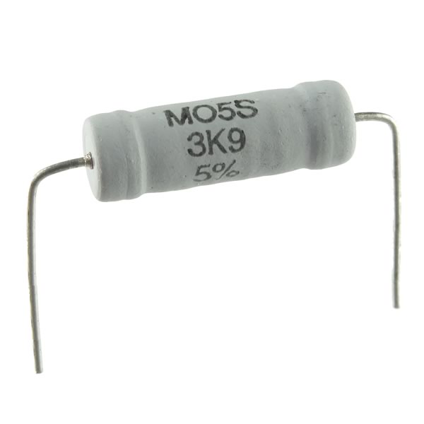 Welwyn M05S 5Watt metal oxide film power resistor has a value of 3.9K Ohm. Size 25mm x 8.5mm. Has leads on 30mm centers bent as shown. Sold in a package of 2.