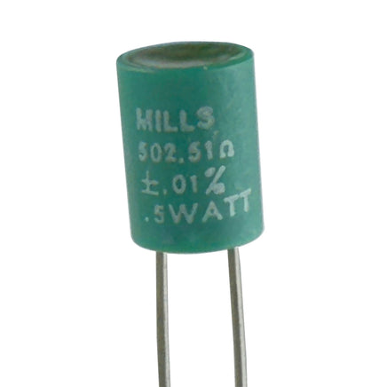 Super precision calibration resistor by Mills Electronics type RCL024 is rated 502.51 Ohm at 0.01% (much more precision than 1%) and±5PPM (temperature coefficient per degree Celsius). Size 0.370" diameter x 0.442" tall. Great for calibrating extremely accurate lab equipment. Has long radial leads.