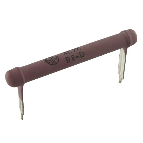 HTR silicon coated power resistor type F-7P is rated 4.7K 6.5Watt. Size 43.5mm long x 5.0mm dia. Leads are on 35.4mm centers. Marked 4K7K B8-D F-7P. New!