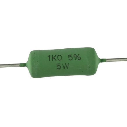 Stackpole 1K Ohm 5 Watt resistor type RSDW5-1 has silicon molded case and full length axial leads. Size of body 0.7" long x 0.27" dia. Tolerance is 5%.