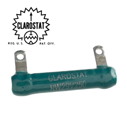Clarostat RV29V250 is a 25 Ohm 10 Watt power resistor with coated ceramic body. Size 1.75" long x 0.35" dia. Has solder plated terminals as shown.