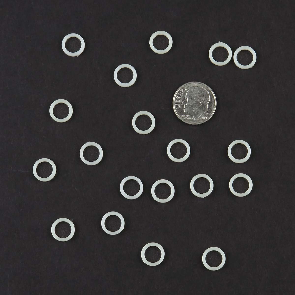 Nylon ring spacers are 0.37" outside diameter, 0.27" inside diameter and 0.06" thick. Sold in a package of 20.