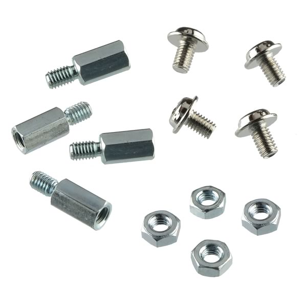 Aluminum hex threaded standoff is 0.32" tall and has a 0.18" tall threaded stud on top. Bottom of standoff is threaded for M3X0.5 screw (included). The top stud is threaded for M3X0.5 nut (included). Sold in a package of 4 nuts, 4 standoffs and 4 screws all in one convenient package!