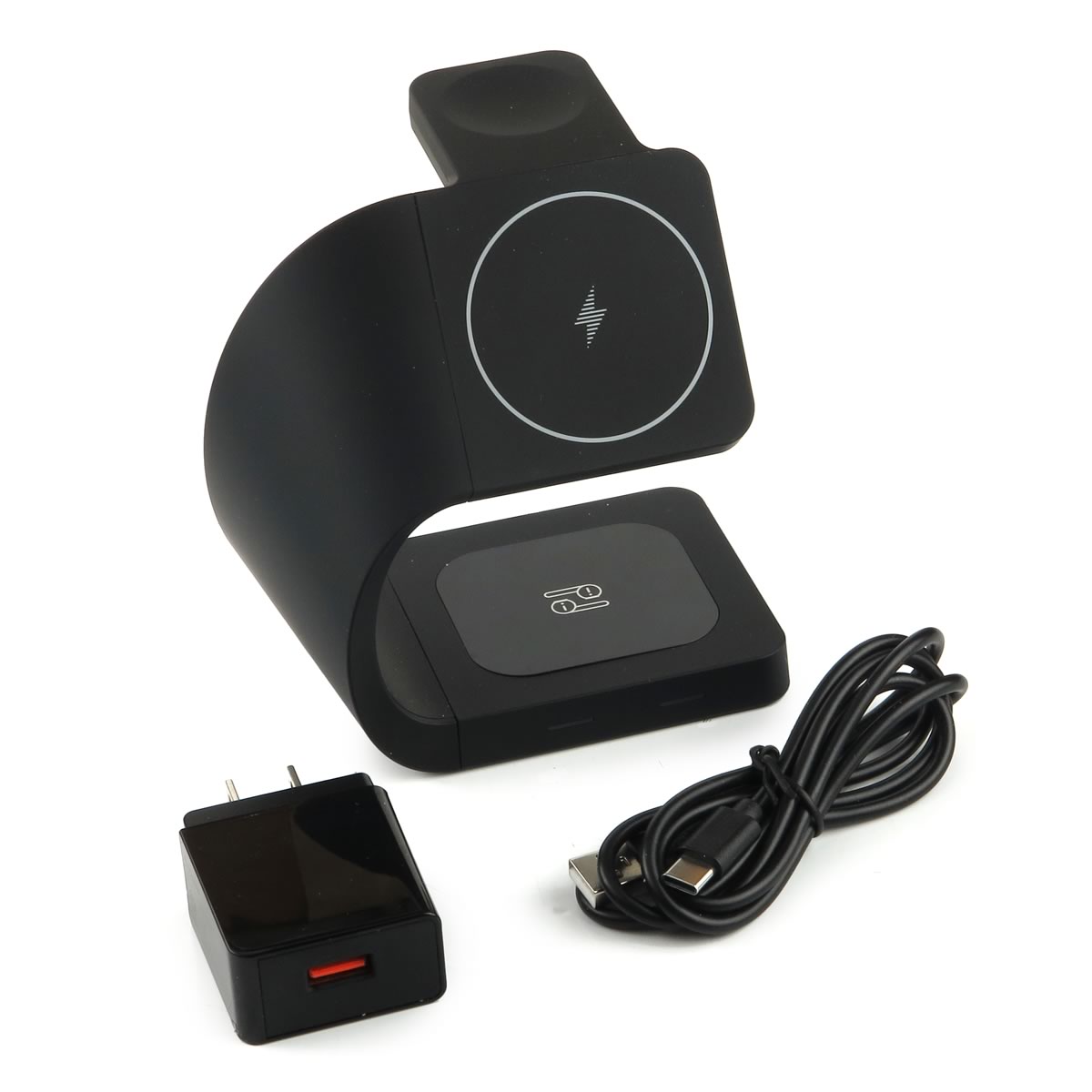Ockered H31 3-in-1 magnetic wireless charging station works with iPhone 14, 13, 12 ProMax/Pro/Mini, iWatch 8/7/6/5/4/3 SE, Air Pods 3/2/Pro. This brilliant charger wirelessly charges your cellphone, iWatch and Air Pods simultaneously. The magnetic surface holds your iPhone at the correct point for charging. Comes complete with compatible charger that plugs into wall and micro-C cable to connect to charger. Brand new in retail box. Retails for $29.95