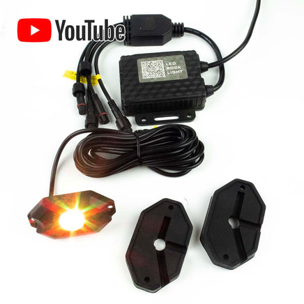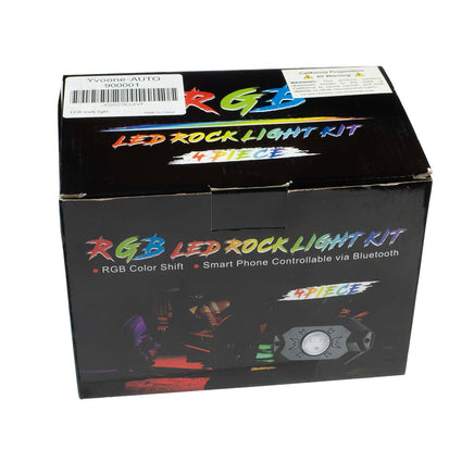 RGB LED Rock Light Kit contains 4 Pods of multicolor rock lights for cars, trucks and ATV's with phone app control, timing and music mode etc. Easy to install, RBG 16 million colors, 29 style scenes mode, music to light sync mode, mic audio input voice control and schedule timing function. Video below demos the lighting modes. Download Free Lotus Lantern App for Android 4.3 iOS 9.9 and above - Scan QR code on box to install app. Suitable for easy installation of lights on trucks, SUV's, UTV, ATV, motorcycles, etc. Comes with 2 mounting pads, one for flat surfaces and one for round tubular pipes and bars. Note: Please watch videos online to see how to install kit. Comes with instructions on how to use the app but are no instructions for mounting or installation. Brand new in Box. Retails for $36 - Our Golden Price of $19.95.