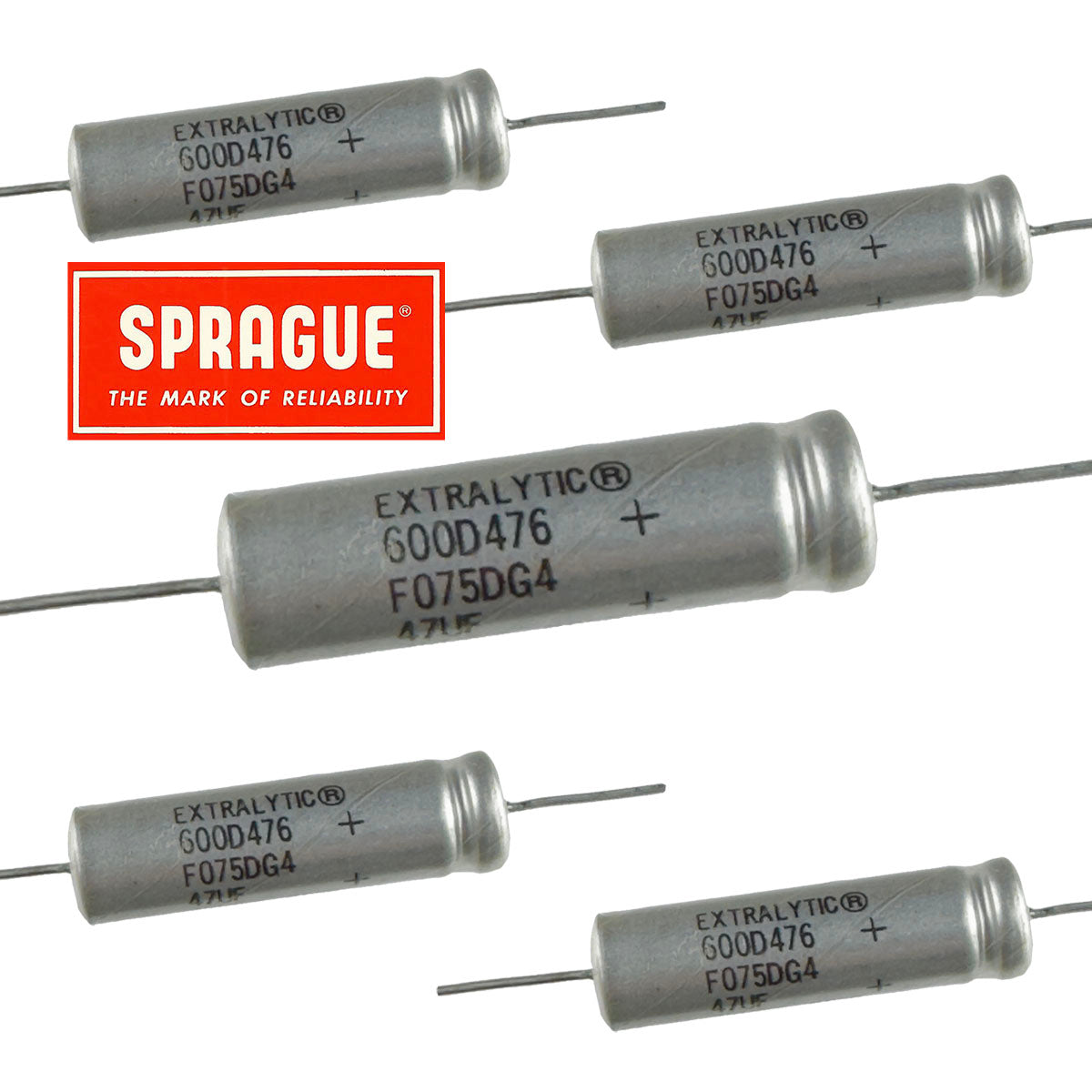 Very high quality Sprague Extralytic® 47uF 75V Aluminum case axial electrolytic capacitor. Size of case 10mm (dia.) x 37mm long (excluding long axial leads). The Sprague Extralytic® label denotes one of the best axial capacitors made that are sought after by audio amplifier/guitar enthusiasts. Sold in a Package of 5. Brand new - being sold currently online for up to $25 each!