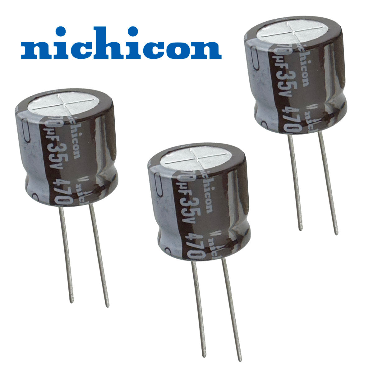 Nichicon Compact 470µF 35V 105°C radial capacitor PM Series is only 16mm dia × 16mm H. Has full length leads. Sold in a package of 3.