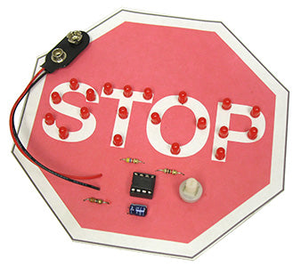 This kit features 20 small LEDS which flash a bright red color. Features a red and white label which you glue to the octagon shaped PC board and a reliable 1 IC circuit. The circuitry features a small control to adjust the flash speed. Operates from one 9V battery (not included). Overall size: about 5" x 5".Complete with all parts, label, PC board and instructions. Skill Level 1.| Related Items |