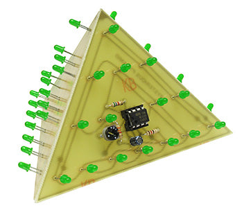 Very unique kit consists of 3 circuit boards that when assembled form a 3 dimensional flashing GREEN LED pyramid. This mysterious and amazing kit features 47 bright LEDs that flash at a rate that you can adjust using a small control. Operates from one 9V battery (not included) and uses a reliable one IC circuit. The pyramid is about 3" high and has a 4-1/2" base. The pyramid is hollow inside and can be set on top of the 9V battery to conceal it.Complete with all parts, PC board and instructions. Skill Level 2.