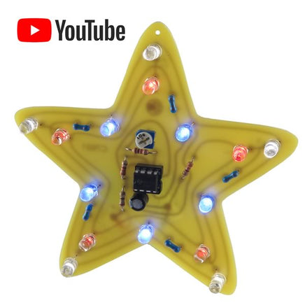 This kit makes learning to solder fun with its Star-Spangled Flashing design. The eye-catching Patriotic Flashing Star strobes 15 brilliant Red, White and Blue LEDs which outline the special cut 4-40" star shaped PC board.Practice your soldering technique first with the special "Dogbone" practice resistors. After you connect a few, you will be comfortable and ready to solder the other components to the PC board with confidence.The speed of the flashing LEDs can be adjusted with the trimmer resistor located above the IC chip. Celebrate the 4th of July, Memorial Day, Labor Day, or Your Birthday with this colorful display. Operates from one 9V battery (sold separately). Size of PC board is 4-1/4". Complete with all parts, PC board and instructions. Skill Level 1.