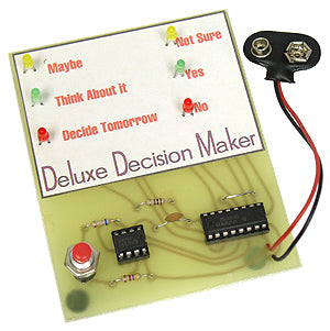 Let this colorful "electronic brain" make all of your important decisions for you. Displays the results to your questions using a variety of bright colored LEDs.This kit uses a 2 IC circuit and a label you glue onto the PC board. Simply press the start button and all of the LEDs begin to flash. As soon as you release the button, one LED will glow to indicate the "electronic brain's" decision. Lots of fun to use and easy to build.Operates from one 9V battery (not included). Size of PC board: 3" x 3-5/8". Complete with all parts, label, PC board and instructions. Skill Level 2.| Related Items |