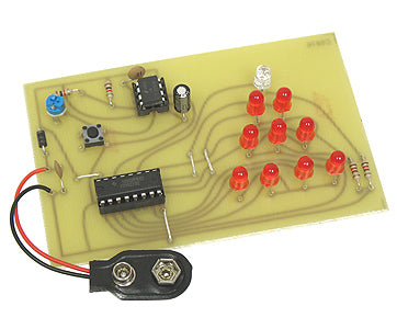 This exciting game kit features a bright red LED pyramid with a clear LED on top. When power is applied each of the 10 LEDs light up in a sequencing pattern. If you press and hold the small pushbutton just before the top clear LED is to light, this LED will stay on illuminating its bright orange glow indicating that you made it to the top and picked up the gold. If however your timing is off, one of the red LEDs will light up indicating "you lost".To make the game even more interesting, a control is provided to speed things up! When its adjusted to its fastest position you'll need excellent reflexes and eye to hand coordination to Grab the Gold!Operates on one 9V battery not included. Size of board 2-1/2" x 4". Complete with all parts, PC board and instructions. Skill Level 2.| Related Items |