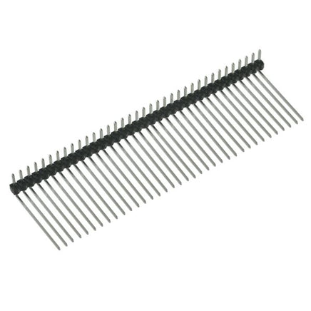 36 pin single row right angle snap apart (breakaway) male header. Features 0.944" (24mm) mating post length and 0.226" (5.75mm) termination post length. Overall header height is approximately 0.40" (10mm). Standard 0.10" (2.54mm) pin spacing. Tin plated pins.