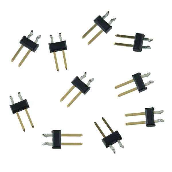 Single row 2 pin male header features gold plating on contact area and solder plating bottom pins. Pins are on standard 0.1" centers. Sold in a package of 10.