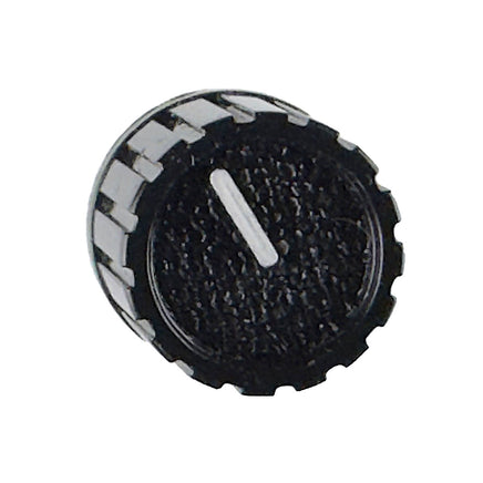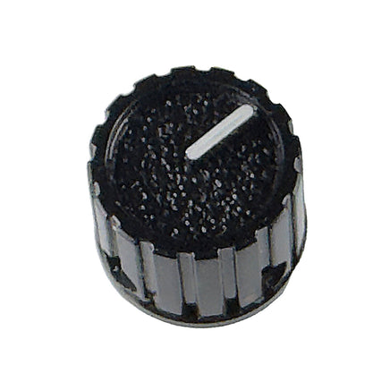Small precision made set screw black knob for 1/8" diameter shafts has white pointer and ribbed outer surface. Size about 0.54" diameter x 0.44" tall. Has 2 set screws with metal insert. New!