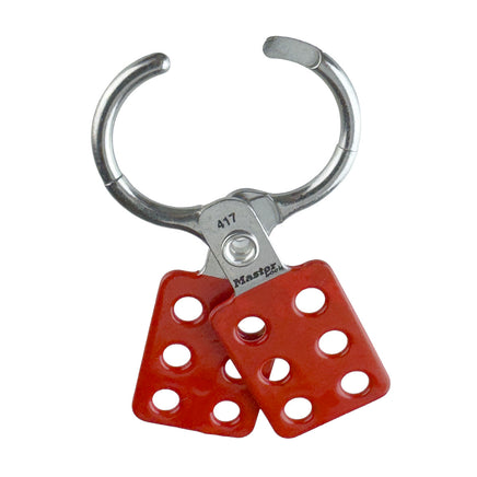 Masterlock Model 417 red lockout Has has 1-1/2" opening and can handle up to 6 padlocks with shackle diameter of 3/8". Overall width 2" - overall length is 4-7/8". Brand new. Retails for $19.00