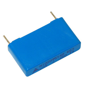 Radial type compact film capacitor is rated .39°F 250V. Size is 1.03" x .23" x .6" Tall. Has PC leads on .86" centers. Package of 4.G16761