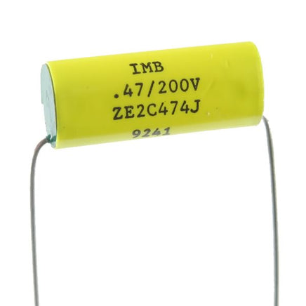 Metalized polyester film capacitor by IMB Part# ZE2C474J is rated 0.47uF 200V. Size is 0.89" long x 0.36" x 0.27". Has long axial leads bent over as shown. Sold in a package of 10.