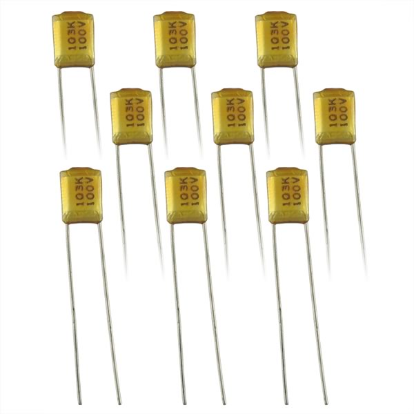 Small radial film capacitor is rated 0.01uF (103) @ 100V. Size is only 0.23" x 0.35" x 0.11" thick. Has long radial leads. Sold in a package of 10.