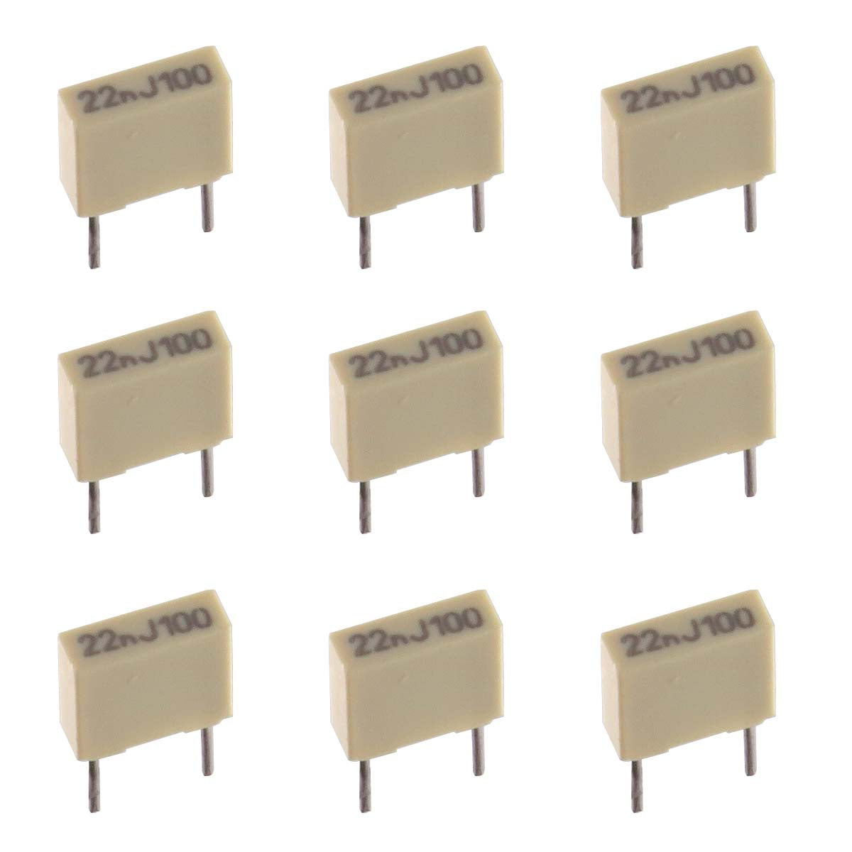 Miniature 0.022UF 100V 5% (22nj100) film capacitor has 5mm lead spacing (0.20"). Size only 0.29" x 0.094" x 0.26" tall. Sold in a package of 10.