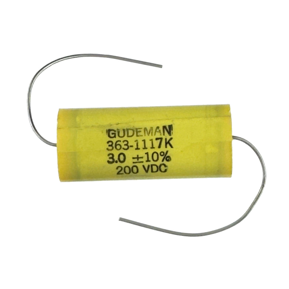 Gudeman polyester film axial lead capacitor is rated 3.0uF 10% tolerance 200VDC. Size is 0.67" x 0.45" x 1.55" long.