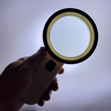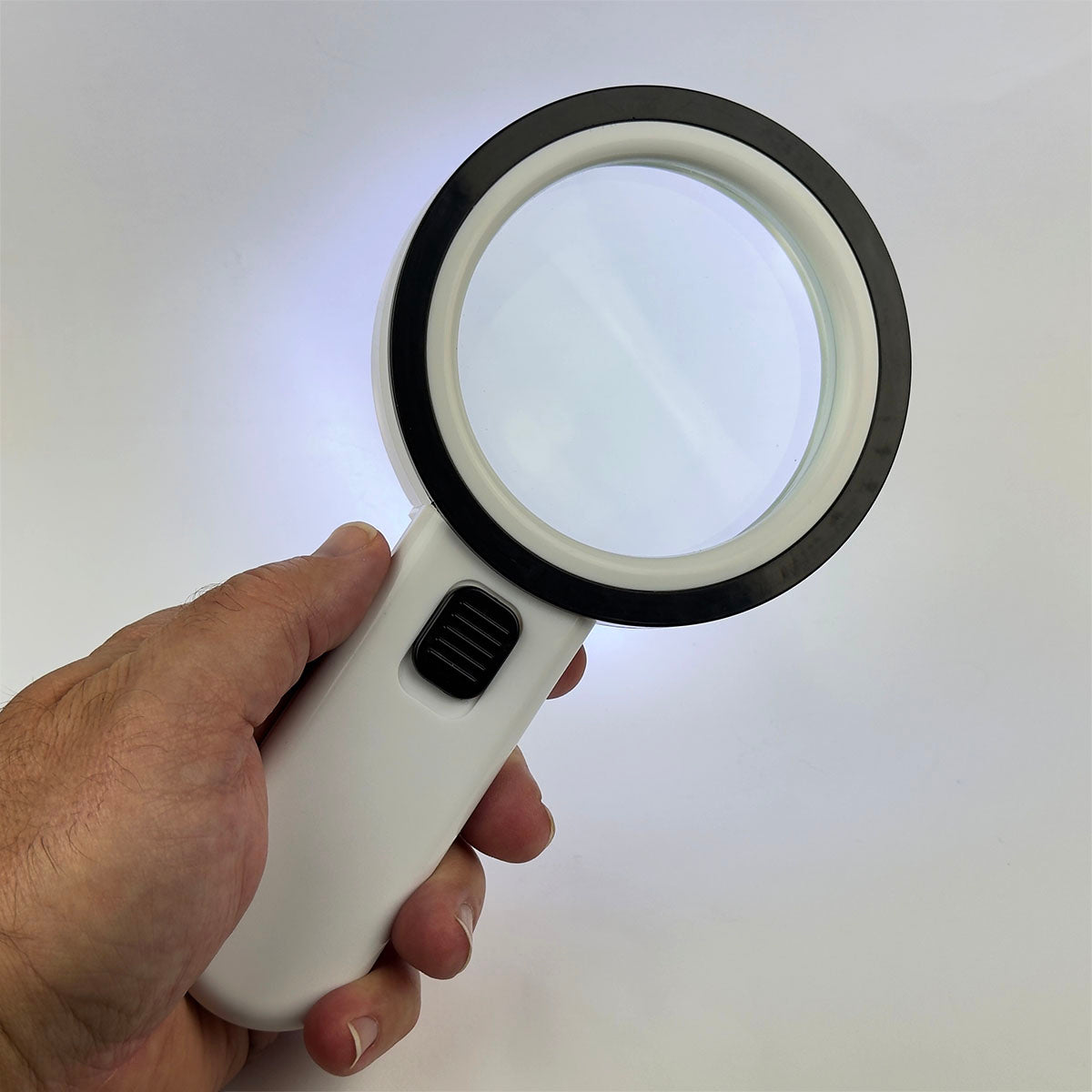 This awesome powerful and useful double glass lens magnifier has 12 powerful white LEDs surrounding the lens. Great for illuminating texts, stamps, coins, instructions, prescription information, tiny SMD parts, IC's etc. Requires 2 "AA" batteries (not included). Lens is 3.1" effective diameter. Overall size is 4.275" diameter X 8" X 1" thick. Well made with on/off switch built into the handle. Makes a great gift. Retails for $14.95 and up.