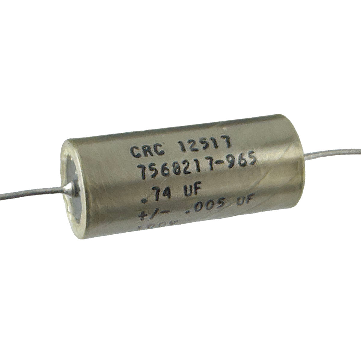 CRC (Component Research Company) ultra precision axial capacitor is rated 0.74µF ±0.005µF 100V. Great for calibrating capacitance meters! Size: 1.18" L × 0.50" diameter. Has full length axial leads.