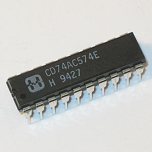 The CD74AC574E octal D-type, 3-state, positive-edge-triggered flip-flops use CMOS technology. The eight flip-flops enter data into their registers on the LOW-to-HIGH transition of the clock (CP). The Output Enable (OE\) controls the 3-state outputs and is independent of the register operation. When the Output Enable (OE\) is HIGH, the outpus are in the high-impendance state.20 pin DIP. Manufactured by Harris.
