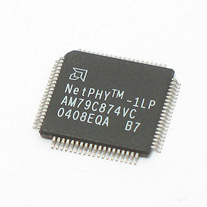 The Am79C874VC NetPHY-1LP device provides the physical (PHY) layer and transceiver functions for one 10/100 Mbps Ethernet port. It delivers the dual benefits of CMOS low power consumption and small package size. Operating at 3.3 V, it consumes only 0.3 W. Three power management modes provide options for even lower power consumption levels. The small 12x12 mm 80-pin PQL package conserves valuable board space on adapter cards, switch uplinks, and embedded Ethernet applications. The NetPHY-1LP 10/100 Mbps Ethernet PHY device is IEEE 802.3 compliant. It can receive and transmit data reliably at over 130 meters. It includes on-chip input filtering and output waveshaping for unshielded twisted pair operation without requiring external filters or chokes. The NetPHY-1LP device can use 1:1 isolation transformers or 1.25:1 isolation transformers. 1.25:1 isolation transformers provide 20% lower transmit power consumption. A PECL interface is available for 100BASE-FX applications. Interface to the Media Access Controller (MAC) layer is established via the standard Media Independent Interface (MII), a 5-bit symbol interface, or a 7-wire (GPSI) interface. Auto-Negotiation determines the network speed and full or half-duplex operation. Automatic polarity correction is performed during Auto-Negotiation and during 10BASE-T signal reception. Multiple LED pins are provided for front panel status feedback. One option is to use two bi-color LEDs to show when the device is in 100BASE-TX or 10BASE-T mode (by illuminating), Half or Full Duplex (by the color), and when data is being received (by blinking). Individual LEDs can indicate link detection, collision detection, and data being transmitted. The NetPHY-1LP device needs only one external 25- MHz oscillator or crystal because it uses a dual-speed clock synthesizer to generate all other required clock domains. The receiver has an adaptive equalizer/DC restoration circuit for accurate clock/data recovery from the 100BASE-TX signal. The NetPHY-1LP device is available in the commercial (0?C to +70?C) or industrial (-40?C to +85?C) temperature ranges. The industrial temperature range is well suited to environments, such as enclosures with restricted air flow or outdoor equipment.Features: