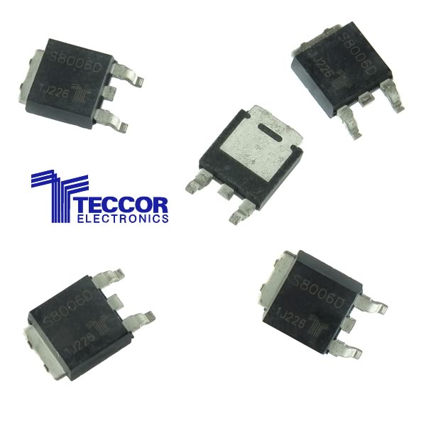 Teccor SCR type S8006D is rated 800V @ 6Amps. This small SCR is easy to use as the terminals on the D-Pak are easy to solder to. Due to its small size and high power rating it is a very useful SCR for strobe lights and hundreds of other applications. Ratings IT(RMS)= 6A, Volts = 800, IGT= 1 milliamp (min) and 15 milliamp (max). Brand new - Sold in a package of 5.