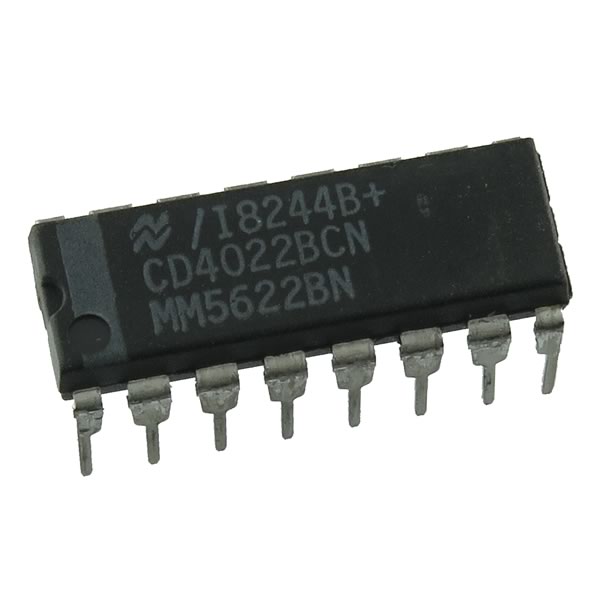 National CD4022BCN octal counter with 8 decoded outputs is a 4 stage Johnson counter having 8 decoded outputs. Inputs include clock, reset and clock inhibit signal. Standard 16 pin DIP package. Sold in a package of 25.