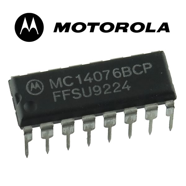 Motorola MC14076B 4-Bit D-Type Register operates synchronously from a common clock. Has OR gated output. Features Three-State outputs with gated control lines. Operates on 3 to 18VDC. Standard 16 pin DIP package. Sold in a package of 5.