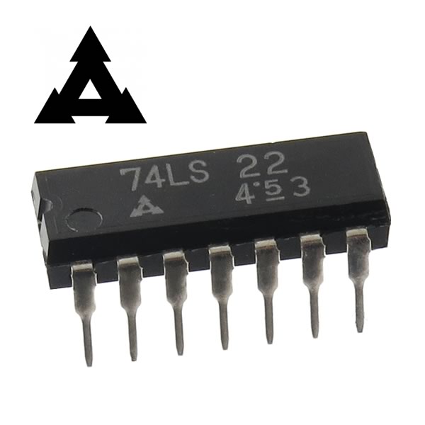 74LS22 dual 4 input positive NAND gates with open collector outputs. These devices contain two independent 4-input NAND gates. The open-collector outputs require pull-up resistors to perform correctly. They may be connected to other-collector outputs to implement active low wired-OR or active-high wired-AND functions. 14 Pin through-hole. Original Matsushita Panasonic Part - New!