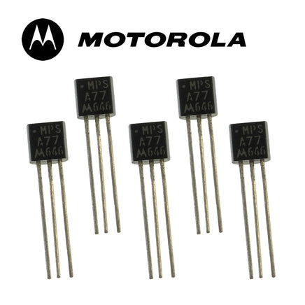 Motorola MPSA77 PNP Darlington Transistor in a TO-92 case is rated 60V 0.5Amp. Gain is 10,000 @ 10mA and power dissipation is 625mW. Sold in a package of 5.